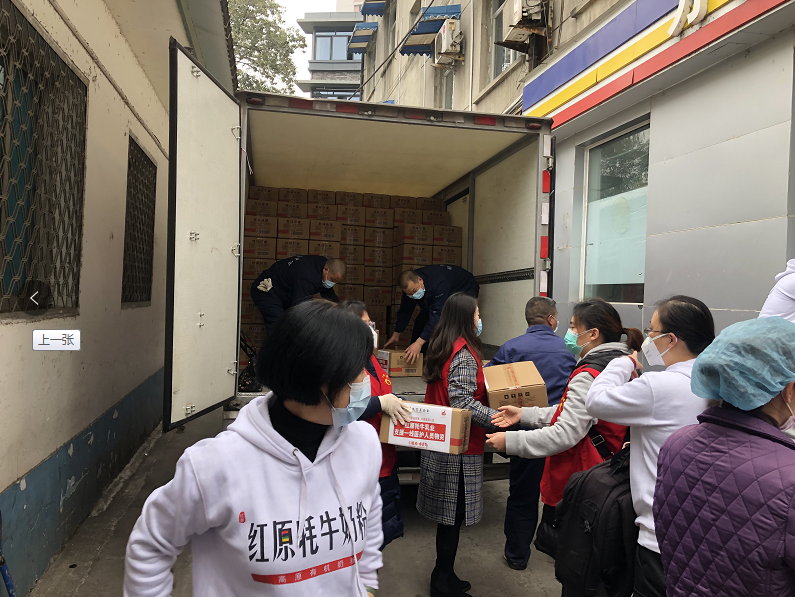 红原乳业董事长谢剑先生(右一)与四川省扶贫基金会副会长兼秘书长陈宏先生(中)、润宝物流总经理杨志翔先生(左一)亲到现场指挥工作。